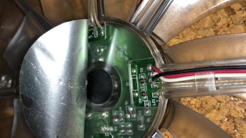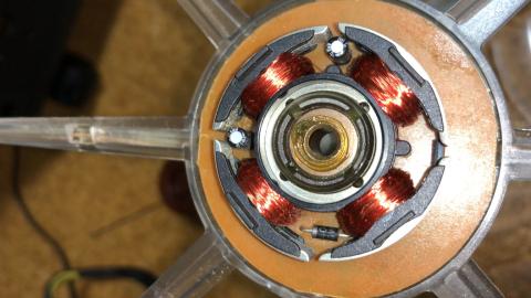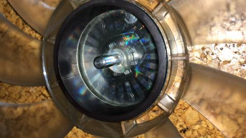 ファンブレードのシャフトとプラワッシャーとスリーブベアリングが見えます。