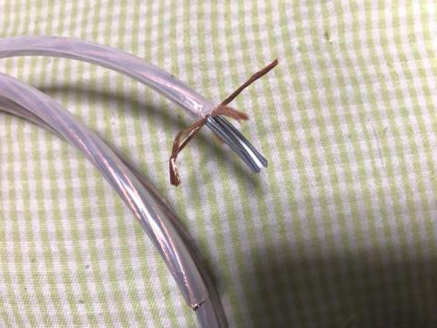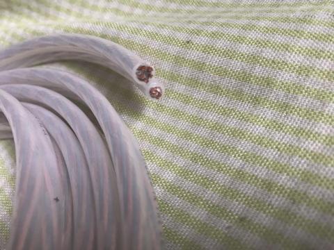 中は予想以上に複雑な構造となっていて、銅線の束が5本入っているほか、中心部分に空芯のチューブや細い錫線と思われるものが入ったチューブなど、かなり手の込んだ造りです。この価格帯でここまで複雑なケーブルはそうそう無いと思います。