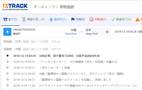 最近のトラッキングは、搭載便までわかることがあります(全部ではないです)。たった1.3ドルの商品にさえです。