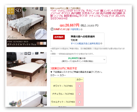 今回、同じような造りのベッドを他のお店でも見つけたのですが、その殆どは発送が1月中旬以降となっていましたので、このショップを選択しましたが、良かったと思います。