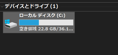 エクスプローラーWindowsの全体容量(36.1GB)と空き容量(21.8GB)