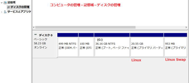 Lubuntuとデュアルブートしているので、ストレージの「システムと予約済み」(30.4GB)はLinux部分も含まれてますね、21GB強はLinuxで使っています。