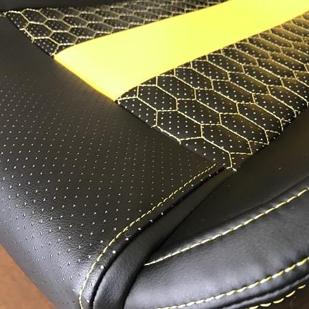 着座シートはPUレザー仕様。シートは一部パンチングされています。少しでも通気性をよくするのでしょうか。縫い目もしっかり直線・綺麗に湾曲していて下手っぽさは全く感じられません。
