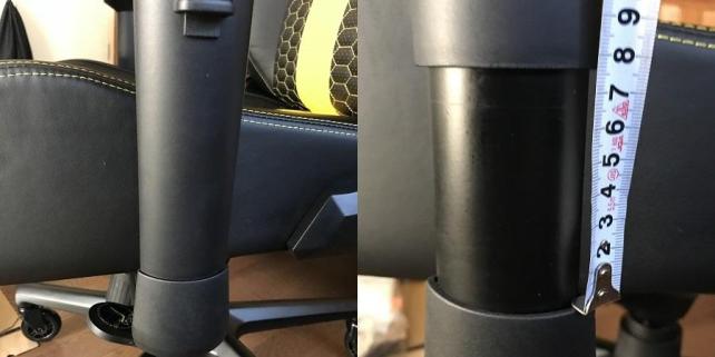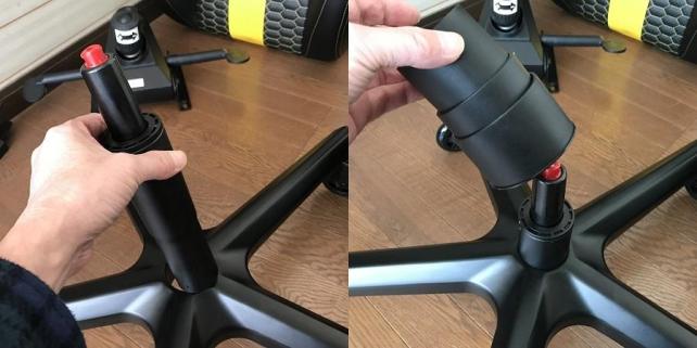キャスターベースのセンターにある穴にガスシリンダーを差し込むだけの仕様。ひっくり返せばすっぽ抜けるので分解も手間いらず。