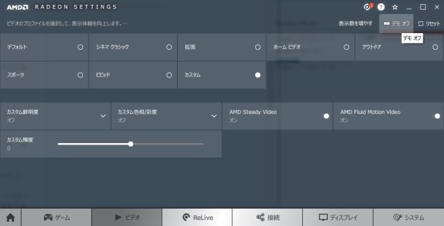 差が分からない・・・そんな方はRadeon Settingを開いてから『ビデオ』をクリックし、(右上にあるはずの)『デモオン』とすればよく分かると思います。