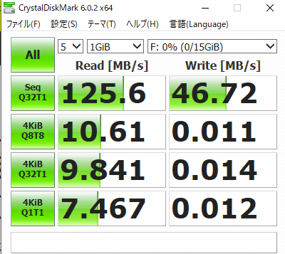 速度結果です。USB3.0の端子に入れて測定をしています。購入価格帯を考えたらお得な商品だと思います。