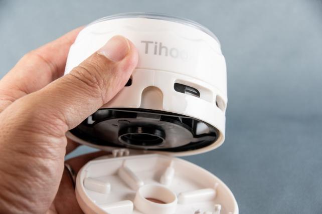 吸い込まれたゴミは底面に溜まっていきます。蓋を外してみると、こんな簡単な構造なのにしっかりフィルターがあって、埃や細かい塵がモーター内部へ入ってしまわないようになっていました。