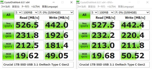 手持ちのCrucial 1TB SSDを搭載して、DiskMarkを走らせてみました。