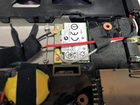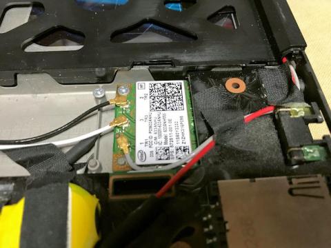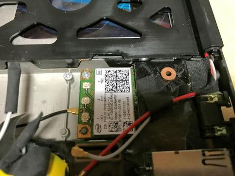 実はこの部分には計5本のアンテナケーブルが来ているのですが、無線LANで使うのは、灰・白・黒の3本です。残る2本(赤・青)はワイヤレスWANモジュールを別途搭載する際に使うものですので、今回の作業では無視して構いません。この辺りもサービスマニュアルにきちんと明記されていますので、特に迷うことはないでしょう。