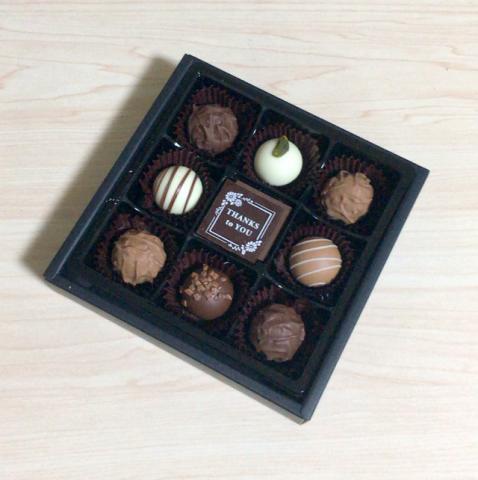 桝は9個ですが、真ん中のスクエアチョコは、薄い板チョコなので2枚重なっているからです。