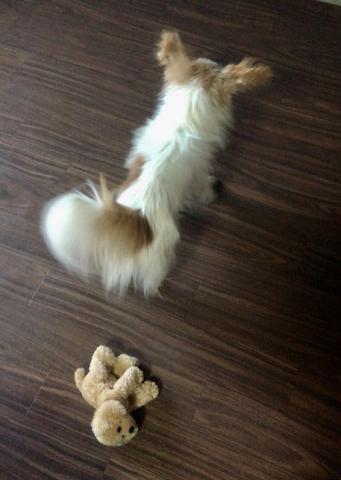 最初のうちは気にしていましたが、最近は「縫いぐるみ」だと判ったのか全く興味を示さなくなってしまいました。