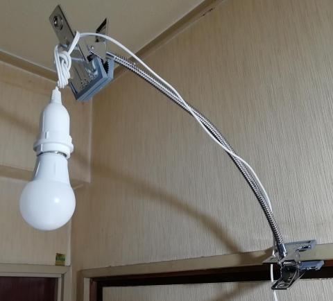 YAZAWAのどっちもクリップ(CLW3)と コード付きソケットで 作業デスク作業面の上方85cmくらいの高さに設置しています。