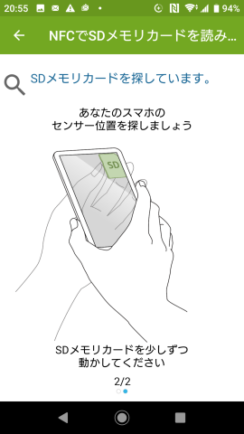 「Memory Card Preview」を起動すると、対応メモリーカードをNFCセンサーに近づけるよう表示されます。ただ、私のXperia XZ Premiumはソフトタイプの樹脂ジャケットを装着しているのですが、センサーに精一杯近づけても高確率で読み込みに失敗します。何度もエラー表示でやり直してどうにか認識に成功しましたが、そこで表示されるのが以下の内容です。