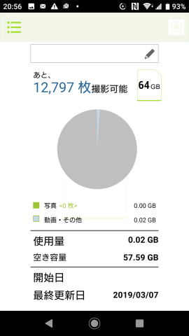 表示されるのは撮影可能枚数と使用量/残容量です。実はこのメモリーカードのルートフォルダー上にJPEG画像を何枚か用意しておいたのですが、サムネイルの取得には成功しませんでした。デジタルカメラで撮影したものに合わせて「DCIM」フォルダーの下に何か新規フォルダーを掘ってファイルを置いておけば違ったのかも知れませんが。