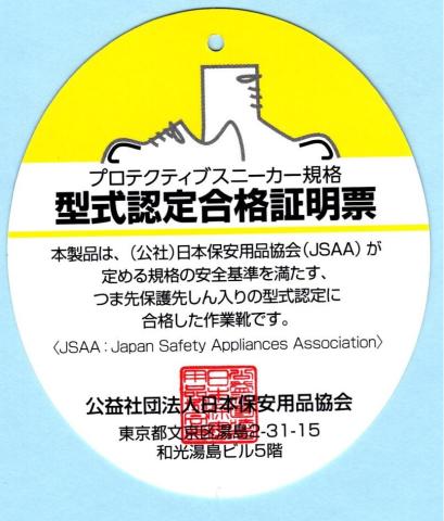 「ALMIGHTY TD11L」は「公益社団法人 日本安全用品協会(JSAA)が定める規格の安全基準を満たす、つま先保護先しん入りの型式認定に合格した作業靴です。」と製品添付の「型式認定合格証明票」に記載があります。・・・写真確認