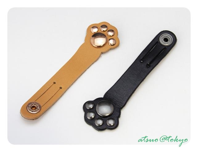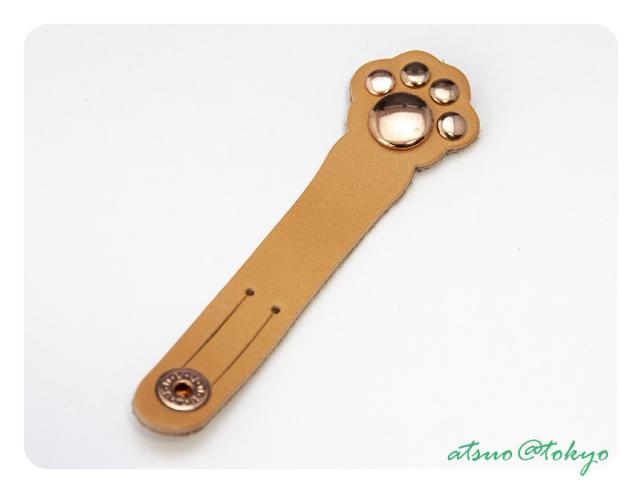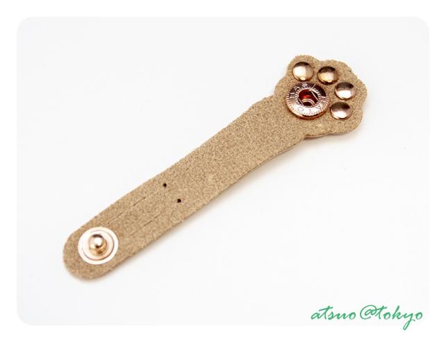 上質な国産牛革(ヌメ革)がネコの手型になっており、肉球部分にはオリジナルの加工が施された金属パーツが使われています。