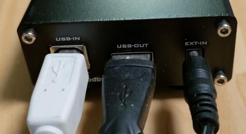 背面(USB-IN:PCへ接続、USB-OUT:USB DACへ接続、EXT-IN:外部供給USB電源へ接続)