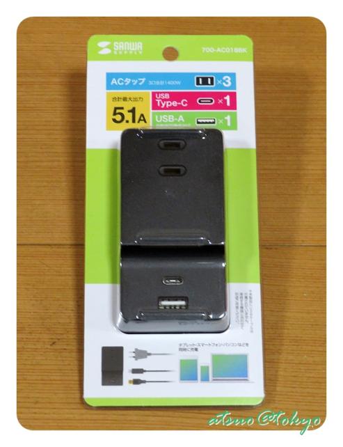 ACコンセント 3つ、USB Aポートと USB Type-Cポートがそれぞれ 1つずつ搭載された充電器です。