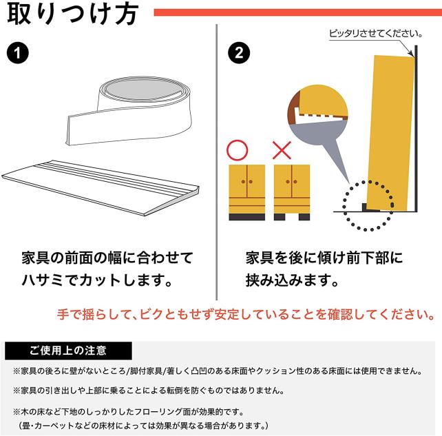 本棚・家具を少しだけ斜めに設置して倒れないようにするアイテムです。