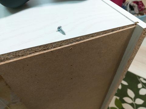 マニュアルを見て作り始めたら、棚板とサイドの固定はガイドホールが空いてて簡単に作れたけど、奥の板と棚板の固定は穴なしでドリルネジで止める感じ。経験上、こういうときはネジがずれて、板がもこっと盛り上がったりするんだよなぁと思ったら案の定…