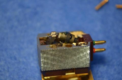 下画面右下で、赤く見えるコイルが2個V型に配置され、V型のマグネットの間に位置します 針の根元にある白いものがダンパーですね 後部からテンションワイヤーでカンチレバーを引いています。右下画像がコイルですがV型に配置され、カンチレバーが縦に突き出た部分に刺さります。