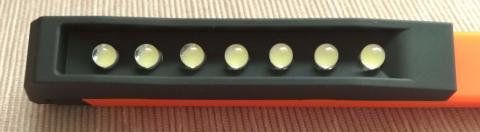 御覧の通り、砲弾型LEDが7灯です。この類で明るいLEDはあまり聞いたことありません。大体数で明るさをごまかす感じなので、私的には期待してないです。ましてやタダでもらえてしまう品物ですので、作業時にまぁまぁ照らしてくれる程度でよいと思っています。