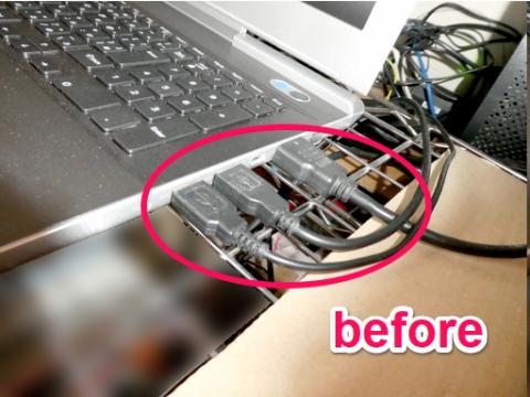 モニタ用のHDMI、キーボード&マウスのUSBケーブルをvostroに挿すと、vostro本体右側がごちゃっとした感じになります。