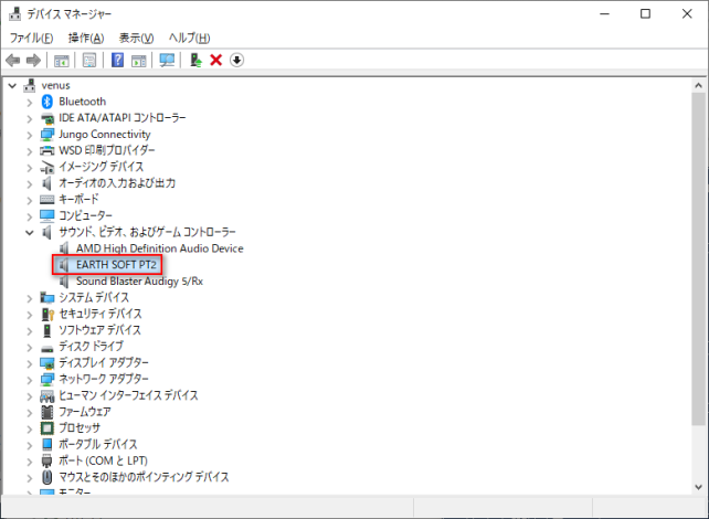 デバイスマネージャの サウンド、ビデオ、およびゲームコントローラー 以下に EarthSoft PT2 の表記を探せば認識しているか確認出来る。
