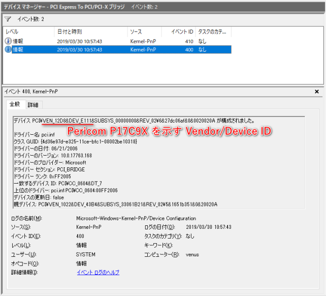デバイスマネージャから システムデバイス 以下 PCI Express To PCI/PCI-X ブリッジ のプロパティを開いて「ハードウェア ID」から「PCI¥VEN_12D8¥DEV_E111」と表示される物を探す。これが PCE2PCI-NO1 のデバイスというか Pericom 製 PI7C9X111SL チップを示す ID になるので、この表示があればライザーカードが正しく認識されていると言うことになる。