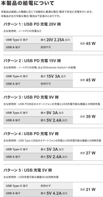 パターン1:Type-Cが20V×2.25A=45W の為、Type-A端子は使えません。