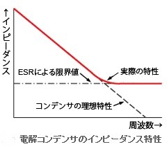 電解コンデンサの場合は、L分よりもR分の影響が大きく、インピーダンス特性は図2のようになる。ただし、L分が影響すると、インピーダンス特性はV字形になる。