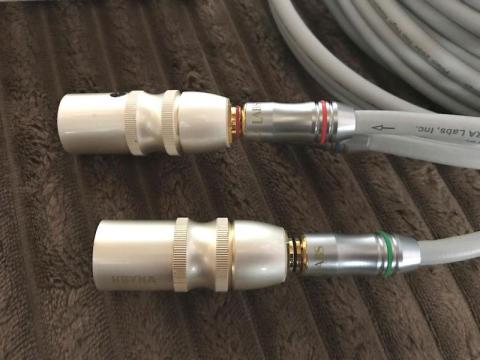 このシリーズの製品は1個単位で販売されているため、ステレオ接続用には2つ必要となります。しかも、色分けにより型番も別れています。今回購入したのは「XLR(オス)→RCA(メス) 2番HOT」という仕様で、左ch用が黒のX/R-9MF2B、右ch用が赤のX/R-9MF2Rとなります。