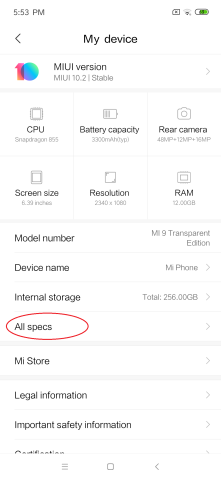 設定のMy deviceよりAll specsに入り、
