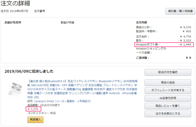 Amazonはカードは使わず、基本的に全部ギフト券買って登録にしてるから、返金処理もリアルタイムでギフトで返ってくるので便利です。