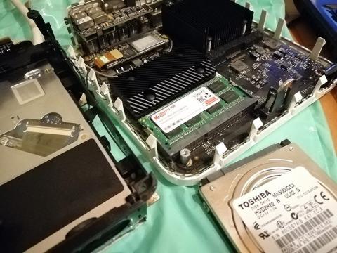 - DDR3 4GB まで(公式)のところ、4GB x 2 枚(KOMPUTER BAY DDR3 PC3-8500 1066MHz SODIMM Non-ECC CL 7-7-7-20 片面8チップx両面)