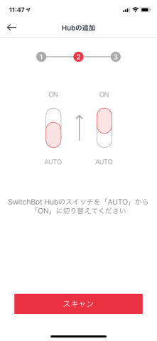 Hubの裏面のスイッチをONにしてスキャンをタップ