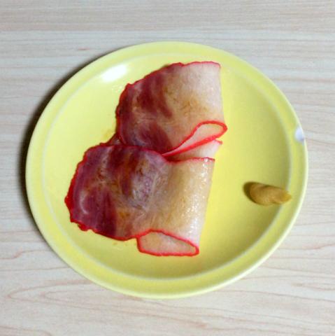 今回は、醤油を少し垂らして辛子を添えて食べました。