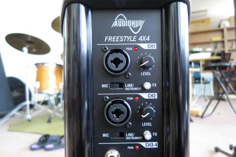 こいつはとっても多機能なのです。まず最初にチャンネル1と2ですが、この入力端子は、フォンとXLRのコンボです。それぞれPEAKインジケータとMIC/LINE切り替えスイッチ、LEVEL、FXのON/OFFがあります。