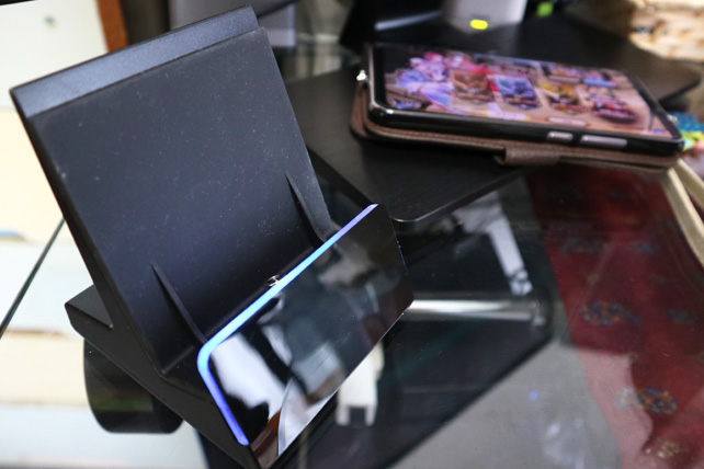 充電中は赤のLED、充電完了は緑。スタンバイが青。ちょっとまぶしいので、寝室にはむかないかなぁ。手帳型ケースでそのまま載せるのも問題ない感じです。