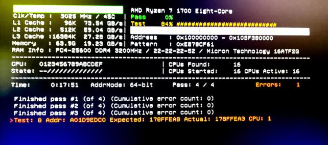 まずは普通にダメ元で3200MHzでmemtest86を回してみます。ぐわぁ。やはりダメか。