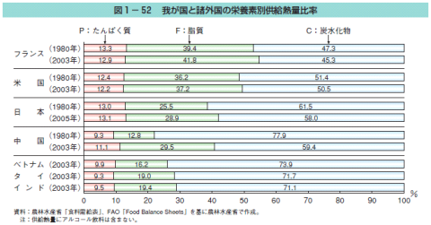 諸外国と日本の一般的なマクロバランス(PFC)をグラフ化すると、実はバランスとしてはかなり良く、世界一の長寿国たる所以は、やはり食事バランスが優れている事だと思います。