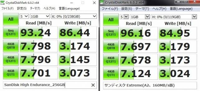 ただし、Extremeシリーズと違ってHIGH ENDURANCEはカタログスペックが『読み込み速度が100MB/s』『書き込み速度が40MB/s』と他社の安いMicroSDとあまり変わらないレベルになっています。