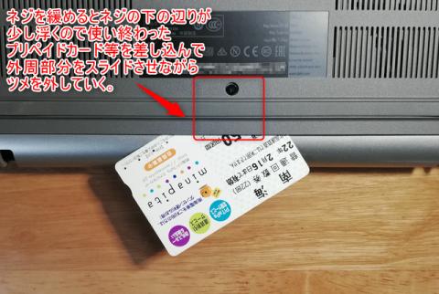 ネジを緩めると、ネジの下辺りが少し浮くので、そこに使い終わったプリペイドカード等を差し込みます。
