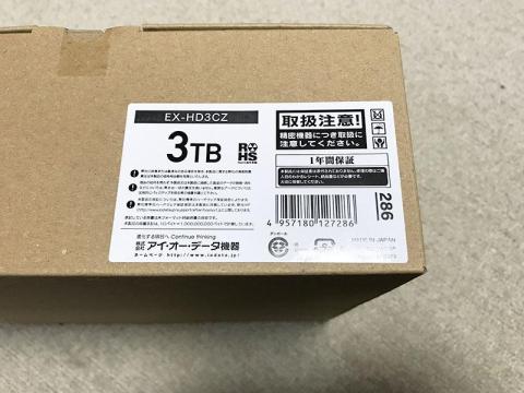 TH-43FX500については後日改めて取り上げるつもりでいますが、リビングで使うTVということで環境整備を急いでいました。そして周辺機器として最後に揃ったのが録画用HDDとして用意した、このI-O DATA EX-HD3CZでした。