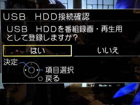 TV接続後、HDDの接続が認識されるとTVがこのように、このTVでHDDを利用するかを尋ねてきます。登録しなければ使えませんので、間違えて接続した場合を除き「はい」を選択することになります。