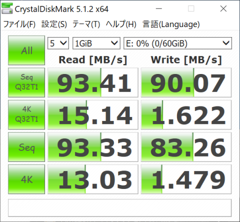 Windowsでは、Read、Writeともに90MB/s前後の限界値となりました。