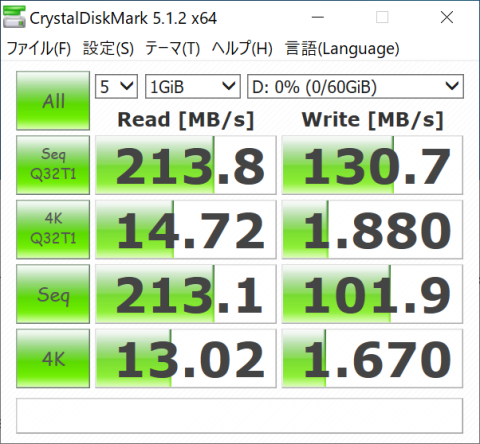 Windows Read:213MB/s、Write:130MB/s