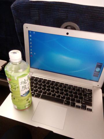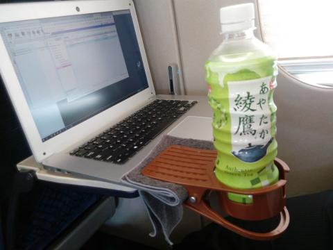 新幹線の壁との隙間にうまいことカップホルダーが収まって、これ以上ない安定感と使い勝手を手にすることができました。まぁ、PCは多少がたがたしてしまうのですが、そんな時はなにか挟んでなんとかしてください。