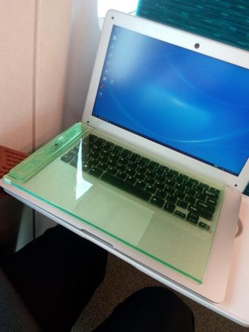 なんだか一種異様なテーブルセットが出来上がりました。PCのキーボード部分にバインダーをかぶせてしまっているのでキー操作はできません。基本マウス+スクリーンキーボードという使い方になります。