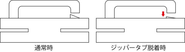 上記は、ジッパーのスライダー部分を真横から見た時の図で、タブを外から通すときには、凹んで通しやすくなる機構が付いています。